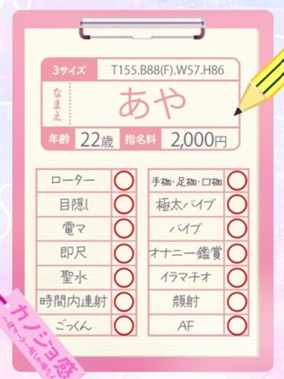 【Fカップの魅力】 【黒髪清楚の美女とAFも・・・!】 オールラウンダーとはまさに 【あや】ちゃんの事を言います・・・‼ 扉を開けた瞬間に 笑顔満点なあやさんが優しく お兄様をお出迎えしてくれます♡ お部屋に入ると 明るい性格&超おもてなしの精神で 緊張してたはずが 一瞬で穏やかな まるで昔ながらの友人だったかのような 落ち着いた感情になる事でしょう♪ そして何といっても 【巨乳で美乳なFカップで様々な技で魅了】 【ぷりぷりのお尻を眺めながらの【AF】】 ハッキリ言います‼ 【時間がどれだけあっても足りない・・・‼】 何回でも会いたくなり その笑顔とえっちえちなボディを 堪能したくなる 【中毒性満載な女の子】ですので 是非【あや】ちゃん中毒になっちゃって下さい♡